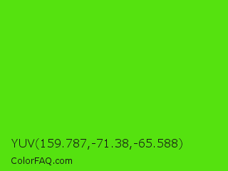 YUV 159.787,-71.38,-65.588 Color is a normal green color and the nearest color is Harlequin Green #46cb18. Hex code #55e20f and RGB value is rgb(85,226,15). In RGB color space, this color is composed of 33% red, 89% green, 6% blue, In CMYK color space, this color is composed of 62% cyan, 0% magenta, 93% yellow , 11% black , In HSL color space, this color has a hue angle of 100° , 88% saturation and 47% lightness.