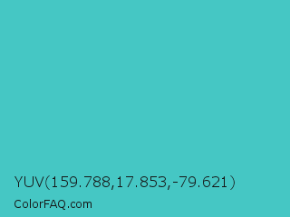 YUV 159.788,17.853,-79.621 Color is a normal cyan color and the nearest color is Sea Serpent #4bc7cf. Hex code #45c7c4 and RGB value is rgb(69,199,196). In RGB color space, this color is composed of 27% red, 78% green, 77% blue, In CMYK color space, this color is composed of 65% cyan, 0% magenta, 2% yellow , 22% black , In HSL color space, this color has a hue angle of 179° , 54% saturation and 53% lightness.