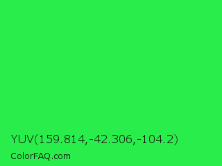 YUV 159.814,-42.306,-104.2 Color is a normal green color and the nearest color is Malachite #0bda51. Hex code #29ed4a and RGB value is rgb(41,237,74). In RGB color space, this color is composed of 16% red, 93% green, 29% blue, In CMYK color space, this color is composed of 83% cyan, 0% magenta, 69% yellow , 7% black , In HSL color space, this color has a hue angle of 130° , 84% saturation and 55% lightness.
