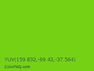 YUV 159.832,-69.43,-37.564 Color is a normal green color and the nearest color is Lima #76bd17. Hex code #75d113 and RGB value is rgb(117,209,19). In RGB color space, this color is composed of 46% red, 82% green, 7% blue, In CMYK color space, this color is composed of 44% cyan, 0% magenta, 91% yellow , 18% black , In HSL color space, this color has a hue angle of 89° , 83% saturation and 45% lightness.