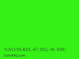YUV 159.833,-67.952,-91.939 Color is a normal green color and the nearest color is Neon Green #39ff14. Hex code #37f016 and RGB value is rgb(55,240,22). In RGB color space, this color is composed of 22% red, 94% green, 9% blue, In CMYK color space, this color is composed of 77% cyan, 0% magenta, 91% yellow , 6% black , In HSL color space, this color has a hue angle of 111° , 88% saturation and 51% lightness.