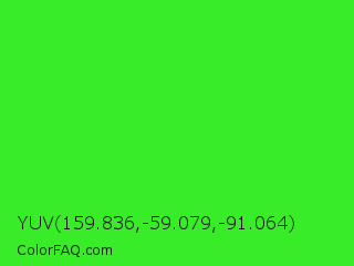 YUV 159.836,-59.079,-91.064 Color is a normal green color and the nearest color is Neon Green #39ff14. Hex code #38ec28 and RGB value is rgb(56,236,40). In RGB color space, this color is composed of 22% red, 93% green, 16% blue, In CMYK color space, this color is composed of 76% cyan, 0% magenta, 83% yellow , 7% black , In HSL color space, this color has a hue angle of 115° , 84% saturation and 54% lightness.