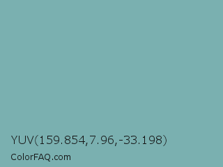 YUV 159.854,7.96,-33.198 Color is a normal cyan color and the nearest color is Gulf Stream #80b3ae. Hex code #7ab0b0 and RGB value is rgb(122,176,176). In RGB color space, this color is composed of 48% red, 69% green, 69% blue, In CMYK color space, this color is composed of 31% cyan, 0% magenta, 0% yellow , 31% black , In HSL color space, this color has a hue angle of 180° , 25% saturation and 58% lightness.
