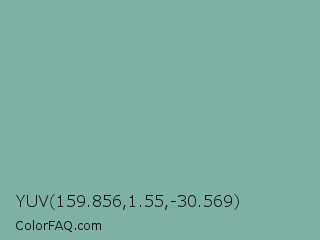 YUV 159.856,1.55,-30.569 Color is a normal cyan color and the nearest color is Acapulco #7cb0a1. Hex code #7db1a3 and RGB value is rgb(125,177,163). In RGB color space, this color is composed of 49% red, 69% green, 64% blue, In CMYK color space, this color is composed of 29% cyan, 0% magenta, 8% yellow , 31% black , In HSL color space, this color has a hue angle of 164° , 25% saturation and 59% lightness.