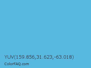 YUV 159.856,31.623,-63.018 Color is a light blue color and the nearest color is Blue Jeans #5dadec. Hex code #58b8e0 and RGB value is rgb(88,184,224). In RGB color space, this color is composed of 35% red, 72% green, 88% blue, In CMYK color space, this color is composed of 61% cyan, 18% magenta, 0% yellow , 12% black , In HSL color space, this color has a hue angle of 198° , 69% saturation and 61% lightness.