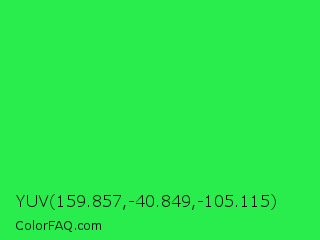 YUV 159.857,-40.849,-105.115 Color is a normal green color and the nearest color is Malachite #0bda51. Hex code #28ed4d and RGB value is rgb(40,237,77). In RGB color space, this color is composed of 16% red, 93% green, 30% blue, In CMYK color space, this color is composed of 83% cyan, 0% magenta, 68% yellow , 7% black , In HSL color space, this color has a hue angle of 131° , 85% saturation and 54% lightness.