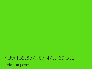 YUV 159.857,-67.471,-59.511 Color is a normal green color and the nearest color is Harlequin Green #46cb18. Hex code #5cdd17 and RGB value is rgb(92,221,23). In RGB color space, this color is composed of 36% red, 87% green, 9% blue, In CMYK color space, this color is composed of 58% cyan, 0% magenta, 90% yellow , 13% black , In HSL color space, this color has a hue angle of 99° , 81% saturation and 48% lightness.