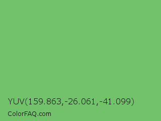 YUV 159.863,-26.061,-41.099 Color is a normal green color and the nearest color is Mantis #74c365. Hex code #71c26b and RGB value is rgb(113,194,107). In RGB color space, this color is composed of 44% red, 76% green, 42% blue, In CMYK color space, this color is composed of 42% cyan, 0% magenta, 45% yellow , 24% black , In HSL color space, this color has a hue angle of 116° , 42% saturation and 59% lightness.