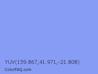 YUV 159.867,41.971,-21.808 Color is a light blue color and the nearest color is Portage #8b9fee. Hex code #879cf5 and RGB value is rgb(135,156,245). In RGB color space, this color is composed of 53% red, 61% green, 96% blue, In CMYK color space, this color is composed of 45% cyan, 36% magenta, 0% yellow , 4% black , In HSL color space, this color has a hue angle of 229° , 85% saturation and 75% lightness.
