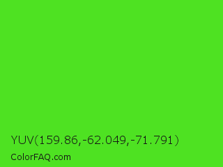 YUV 159.86,-62.049,-71.791 Color is a normal green color and the nearest color is Harlequin Green #46cb18. Hex code #4ee222 and RGB value is rgb(78,226,34). In RGB color space, this color is composed of 31% red, 89% green, 13% blue, In CMYK color space, this color is composed of 65% cyan, 0% magenta, 85% yellow , 11% black , In HSL color space, this color has a hue angle of 106° , 77% saturation and 51% lightness.
