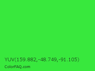 YUV 159.882,-48.749,-91.105 Color is a normal green color and the nearest color is Lime Green #32cd32. Hex code #38e83d and RGB value is rgb(56,232,61). In RGB color space, this color is composed of 22% red, 91% green, 24% blue, In CMYK color space, this color is composed of 76% cyan, 0% magenta, 74% yellow , 9% black , In HSL color space, this color has a hue angle of 122° , 79% saturation and 56% lightness.
