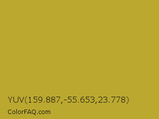 YUV 159.887,-55.653,23.778 Color is a normal yellow color and the nearest color is Hokey Pokey #c8a528. Hex code #bba82f and RGB value is rgb(187,168,47). In RGB color space, this color is composed of 73% red, 66% green, 18% blue, In CMYK color space, this color is composed of 0% cyan, 10% magenta, 75% yellow , 27% black , In HSL color space, this color has a hue angle of 52° , 60% saturation and 46% lightness.