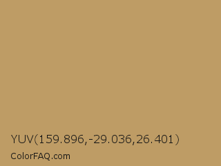 YUV 159.896,-29.036,26.401 Color is a normal orange color and the nearest color is Desert Camel #c19a6b. Hex code #be9c65 and RGB value is rgb(190,156,101). In RGB color space, this color is composed of 75% red, 61% green, 40% blue, In CMYK color space, this color is composed of 0% cyan, 18% magenta, 47% yellow , 25% black , In HSL color space, this color has a hue angle of 37° , 41% saturation and 57% lightness.