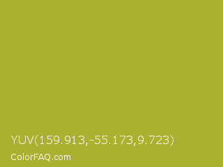 YUV 159.913,-55.173,9.723 Color is a normal yellow color and the nearest color is Citron #9fa91f. Hex code #abb030 and RGB value is rgb(171,176,48). In RGB color space, this color is composed of 67% red, 69% green, 19% blue, In CMYK color space, this color is composed of 3% cyan, 0% magenta, 73% yellow , 31% black , In HSL color space, this color has a hue angle of 62° , 57% saturation and 44% lightness.