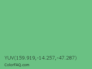 YUV 159.919,-14.257,-47.287 Color is a normal green color and the nearest color is Iguana Green #71bc78. Hex code #6ac183 and RGB value is rgb(106,193,131). In RGB color space, this color is composed of 42% red, 76% green, 51% blue, In CMYK color space, this color is composed of 45% cyan, 0% magenta, 32% yellow , 24% black , In HSL color space, this color has a hue angle of 137° , 41% saturation and 59% lightness.