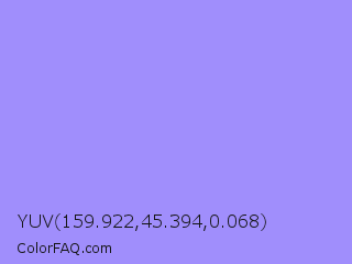 YUV 159.922,45.394,0.068 Color is a light indigo color and the nearest color is Dull Lavender #a899e6. Hex code #a08efc and RGB value is rgb(160,142,252). In RGB color space, this color is composed of 63% red, 56% green, 99% blue, In CMYK color space, this color is composed of 37% cyan, 44% magenta, 0% yellow , 1% black , In HSL color space, this color has a hue angle of 250° , 95% saturation and 77% lightness.