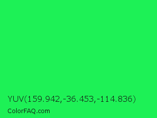 YUV 159.942,-36.453,-114.836 Color is a normal green color and the nearest color is Malachite #0bda51. Hex code #1df156 and RGB value is rgb(29,241,86). In RGB color space, this color is composed of 11% red, 95% green, 34% blue, In CMYK color space, this color is composed of 88% cyan, 0% magenta, 64% yellow , 5% black , In HSL color space, this color has a hue angle of 136° , 88% saturation and 53% lightness.