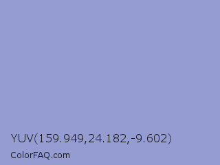 YUV 159.949,24.182,-9.602 Color is a light blue color and the nearest color is Ceil #92a1cf. Hex code #959cd1 and RGB value is rgb(149,156,209). In RGB color space, this color is composed of 58% red, 61% green, 82% blue, In CMYK color space, this color is composed of 29% cyan, 25% magenta, 0% yellow , 18% black , In HSL color space, this color has a hue angle of 233° , 39% saturation and 70% lightness.