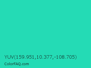 YUV 159.951,10.377,-108.705 Color is a normal cyan color and the nearest color is Turquoise PWG #30d5c8. Hex code #24dbb5 and RGB value is rgb(36,219,181). In RGB color space, this color is composed of 14% red, 86% green, 71% blue, In CMYK color space, this color is composed of 84% cyan, 0% magenta, 17% yellow , 14% black , In HSL color space, this color has a hue angle of 168° , 72% saturation and 50% lightness.