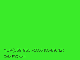 YUV 159.961,-58.648,-89.42 Color is a normal green color and the nearest color is Neon Green #39ff14. Hex code #3aeb29 and RGB value is rgb(58,235,41). In RGB color space, this color is composed of 23% red, 92% green, 16% blue, In CMYK color space, this color is composed of 75% cyan, 0% magenta, 83% yellow , 8% black , In HSL color space, this color has a hue angle of 115° , 83% saturation and 54% lightness.