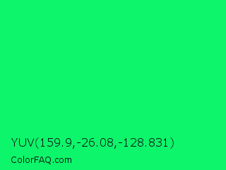 YUV 159.9,-26.08,-128.831 Color is a normal green color and the nearest color is Spring Green #00ff7f. Hex code #0df56b and RGB value is rgb(13,245,107). In RGB color space, this color is composed of 5% red, 96% green, 42% blue, In CMYK color space, this color is composed of 95% cyan, 0% magenta, 56% yellow , 4% black , In HSL color space, this color has a hue angle of 144° , 92% saturation and 51% lightness.