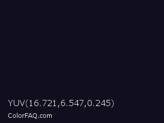 YUV 16.721,6.547,0.245 Color is a almost black indigo color and the nearest color is Vulcan #10121d. Hex code #110e1e and RGB value is rgb(17,14,30). In RGB color space, this color is composed of 7% red, 5% green, 12% blue, In CMYK color space, this color is composed of 43% cyan, 53% magenta, 0% yellow , 88% black , In HSL color space, this color has a hue angle of 251° , 36% saturation and 9% lightness.