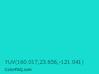 YUV 160.017,23.656,-121.041 Color is a normal cyan color and the nearest color is Bright Turquoise #08e8de. Hex code #16ddd0 and RGB value is rgb(22,221,208). In RGB color space, this color is composed of 9% red, 87% green, 82% blue, In CMYK color space, this color is composed of 90% cyan, 0% magenta, 6% yellow , 13% black , In HSL color space, this color has a hue angle of 176° , 82% saturation and 48% lightness.