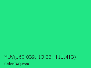 YUV 160.039,-13.33,-111.413 Color is a normal green color and the nearest color is Shamrock #33cc99. Hex code #21e685 and RGB value is rgb(33,230,133). In RGB color space, this color is composed of 13% red, 90% green, 52% blue, In CMYK color space, this color is composed of 86% cyan, 0% magenta, 42% yellow , 10% black , In HSL color space, this color has a hue angle of 150° , 80% saturation and 52% lightness.