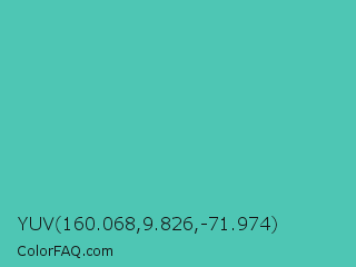 YUV 160.068,9.826,-71.974 Color is a normal cyan color and the nearest color is Puerto Rico #3fc1aa. Hex code #4ec6b4 and RGB value is rgb(78,198,180). In RGB color space, this color is composed of 31% red, 78% green, 71% blue, In CMYK color space, this color is composed of 61% cyan, 0% magenta, 9% yellow , 22% black , In HSL color space, this color has a hue angle of 171° , 51% saturation and 54% lightness.