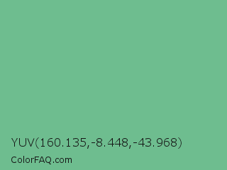 YUV 160.135,-8.448,-43.968 Color is a normal green color and the nearest color is Silver Tree #66b58f. Hex code #6ebd8f and RGB value is rgb(110,189,143). In RGB color space, this color is composed of 43% red, 74% green, 56% blue, In CMYK color space, this color is composed of 42% cyan, 0% magenta, 24% yellow , 26% black , In HSL color space, this color has a hue angle of 145° , 37% saturation and 59% lightness.
