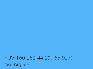 YUV 160.162,44.29,-65.917 Color is a light blue color and the nearest color is Blue Jeans #5dadec. Hex code #55b5fa and RGB value is rgb(85,181,250). In RGB color space, this color is composed of 33% red, 71% green, 98% blue, In CMYK color space, this color is composed of 66% cyan, 28% magenta, 0% yellow , 2% black , In HSL color space, this color has a hue angle of 205° , 94% saturation and 66% lightness.