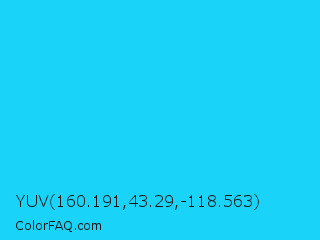 YUV 160.191,43.29,-118.563 Color is a normal cyan color and the nearest color is Spiro Disco Ball #0fc0fc. Hex code #19d4f8 and RGB value is rgb(25,212,248). In RGB color space, this color is composed of 10% red, 83% green, 97% blue, In CMYK color space, this color is composed of 90% cyan, 15% magenta, 0% yellow , 3% black , In HSL color space, this color has a hue angle of 190° , 94% saturation and 54% lightness.