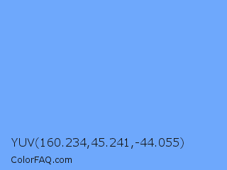 YUV 160.234,45.241,-44.055 Color is a light blue color and the nearest color is French Sky Blue #77b5fe. Hex code #6ea8fc and RGB value is rgb(110,168,252). In RGB color space, this color is composed of 43% red, 66% green, 99% blue, In CMYK color space, this color is composed of 56% cyan, 33% magenta, 0% yellow , 1% black , In HSL color space, this color has a hue angle of 215° , 96% saturation and 71% lightness.