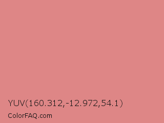 YUV 160.312,-12.972,54.1 Color is a light red color and the nearest color is New York Pink #d7837f. Hex code #de8686 and RGB value is rgb(222,134,134). In RGB color space, this color is composed of 87% red, 53% green, 53% blue, In CMYK color space, this color is composed of 0% cyan, 40% magenta, 40% yellow , 13% black , In HSL color space, this color has a hue angle of 0° , 57% saturation and 70% lightness.
