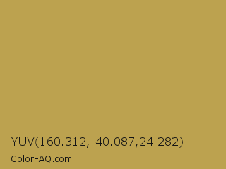 YUV 160.312,-40.087,24.282 Color is a normal yellow color and the nearest color is Husk #b7a458. Hex code #bca24f and RGB value is rgb(188,162,79). In RGB color space, this color is composed of 74% red, 64% green, 31% blue, In CMYK color space, this color is composed of 0% cyan, 14% magenta, 58% yellow , 26% black , In HSL color space, this color has a hue angle of 46° , 45% saturation and 52% lightness.