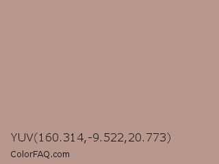 YUV 160.314,-9.522,20.773 Color is a light color and the nearest color is Quicksand #bd978e. Hex code #b8988d and RGB value is rgb(184,152,141). In RGB color space, this color is composed of 72% red, 60% green, 55% blue, In CMYK color space, this color is composed of 0% cyan, 17% magenta, 23% yellow , 28% black , In HSL color space, this color has a hue angle of 15° , 23% saturation and 64% lightness.