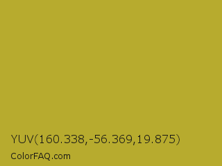 YUV 160.338,-56.369,19.875 Color is a normal yellow color and the nearest color is Hokey Pokey #c8a528. Hex code #b7ab2e and RGB value is rgb(183,171,46). In RGB color space, this color is composed of 72% red, 67% green, 18% blue, In CMYK color space, this color is composed of 0% cyan, 7% magenta, 75% yellow , 28% black , In HSL color space, this color has a hue angle of 55° , 60% saturation and 45% lightness.
