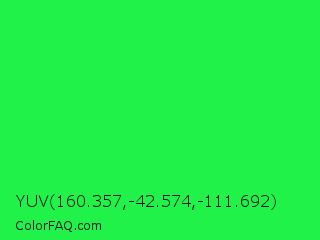 YUV 160.357,-42.574,-111.692 Color is a normal green color and the nearest color is Malachite #0bda51. Hex code #21f24a and RGB value is rgb(33,242,74). In RGB color space, this color is composed of 13% red, 95% green, 29% blue, In CMYK color space, this color is composed of 86% cyan, 0% magenta, 69% yellow , 5% black , In HSL color space, this color has a hue angle of 132° , 89% saturation and 54% lightness.