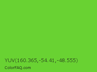 YUV 160.365,-54.41,-48.555 Color is a normal green color and the nearest color is Green RYB #66b032. Hex code #69d232 and RGB value is rgb(105,210,50). In RGB color space, this color is composed of 41% red, 82% green, 20% blue, In CMYK color space, this color is composed of 50% cyan, 0% magenta, 76% yellow , 18% black , In HSL color space, this color has a hue angle of 99° , 64% saturation and 51% lightness.