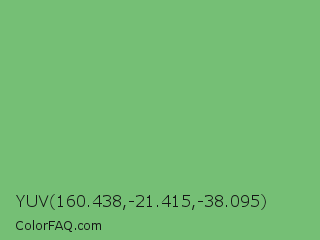 YUV 160.438,-21.415,-38.095 Color is a normal green color and the nearest color is Iguana Green #71bc78. Hex code #75bf75 and RGB value is rgb(117,191,117). In RGB color space, this color is composed of 46% red, 75% green, 46% blue, In CMYK color space, this color is composed of 39% cyan, 0% magenta, 39% yellow , 25% black , In HSL color space, this color has a hue angle of 120° , 37% saturation and 60% lightness.