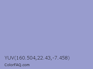 YUV 160.504,22.43,-7.458 Color is a light blue color and the nearest color is Blue Bell Crayola #9999cc. Hex code #989cce and RGB value is rgb(152,156,206). In RGB color space, this color is composed of 60% red, 61% green, 81% blue, In CMYK color space, this color is composed of 26% cyan, 24% magenta, 0% yellow , 19% black , In HSL color space, this color has a hue angle of 236° , 36% saturation and 70% lightness.
