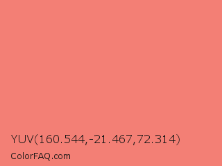 YUV 160.544,-21.467,72.314 Color is a light red color and the nearest color is Tea Rose #f88379. Hex code #f37f75 and RGB value is rgb(243,127,117). In RGB color space, this color is composed of 95% red, 50% green, 46% blue, In CMYK color space, this color is composed of 0% cyan, 48% magenta, 52% yellow , 5% black , In HSL color space, this color has a hue angle of 5° , 84% saturation and 71% lightness.