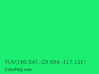 YUV 160.547,-23.934,-117.121 Color is a normal green color and the nearest color is Spring Green #00ff7f. Hex code #1bee70 and RGB value is rgb(27,238,112). In RGB color space, this color is composed of 11% red, 93% green, 44% blue, In CMYK color space, this color is composed of 89% cyan, 0% magenta, 53% yellow , 7% black , In HSL color space, this color has a hue angle of 144° , 86% saturation and 52% lightness.