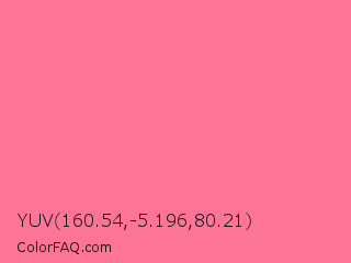 YUV 160.54,-5.196,80.21 Color is a light red color and the nearest color is French Pink #fd6c9e. Hex code #fc7496 and RGB value is rgb(252,116,150). In RGB color space, this color is composed of 99% red, 45% green, 59% blue, In CMYK color space, this color is composed of 0% cyan, 54% magenta, 40% yellow , 1% black , In HSL color space, this color has a hue angle of 345° , 96% saturation and 72% lightness.