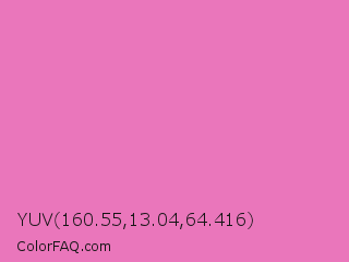 YUV 160.55,13.04,64.416 Color is a light magenta color and the nearest color is Persian Pink #f77fbe. Hex code #ea76bb and RGB value is rgb(234,118,187). In RGB color space, this color is composed of 92% red, 46% green, 73% blue, In CMYK color space, this color is composed of 0% cyan, 50% magenta, 20% yellow , 8% black , In HSL color space, this color has a hue angle of 324° , 73% saturation and 69% lightness.