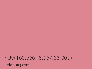 YUV 160.566,-8.167,53.001 Color is a light red color and the nearest color is Shimmering Blush #d98695. Hex code #dd8590 and RGB value is rgb(221,133,144). In RGB color space, this color is composed of 87% red, 52% green, 56% blue, In CMYK color space, this color is composed of 0% cyan, 40% magenta, 35% yellow , 13% black , In HSL color space, this color has a hue angle of 353° , 56% saturation and 69% lightness.