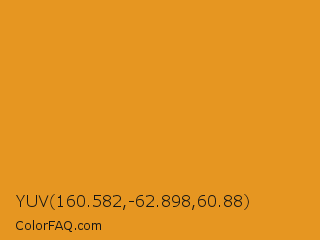 YUV 160.582,-62.898,60.88 Color is a normal orange color and the nearest color is Fire Bush #e89928. Hex code #e69621 and RGB value is rgb(230,150,33). In RGB color space, this color is composed of 90% red, 59% green, 13% blue, In CMYK color space, this color is composed of 0% cyan, 35% magenta, 86% yellow , 10% black , In HSL color space, this color has a hue angle of 36° , 80% saturation and 52% lightness.