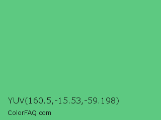 YUV 160.5,-15.53,-59.198 Color is a normal green color and the nearest color is Emerald #50c878. Hex code #5dc981 and RGB value is rgb(93,201,129). In RGB color space, this color is composed of 36% red, 79% green, 51% blue, In CMYK color space, this color is composed of 54% cyan, 0% magenta, 36% yellow , 21% black , In HSL color space, this color has a hue angle of 140° , 50% saturation and 58% lightness.