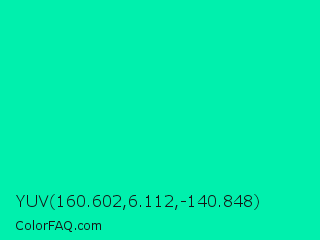 YUV 160.602,6.112,-140.848 Color is a normal green color and the nearest color is Medium Spring Green #00fa9a. Hex code #00f0ad and RGB value is rgb(0,240,173). In RGB color space, this color is composed of 0% red, 94% green, 68% blue, In CMYK color space, this color is composed of 100% cyan, 0% magenta, 28% yellow , 6% black , In HSL color space, this color has a hue angle of 163° , 100% saturation and 47% lightness.
