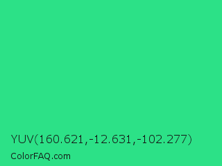 YUV 160.621,-12.631,-102.277 Color is a normal green color and the nearest color is Shamrock #33cc99. Hex code #2ce187 and RGB value is rgb(44,225,135). In RGB color space, this color is composed of 17% red, 88% green, 53% blue, In CMYK color space, this color is composed of 80% cyan, 0% magenta, 40% yellow , 12% black , In HSL color space, this color has a hue angle of 150° , 75% saturation and 53% lightness.